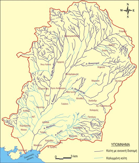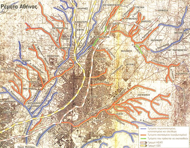 Στα τέλη του 19ου αιώνα, διέσχιζαν το λεκανοπέδιο, 700 χείμαρροι, ποτάμια και ρυάκια. Το 1999, ο αριθμός τους ήταν μικρότερος των 70 (κάτω, δηλαδή και από το 10%) και σήμερα, δεν υπερβαίνουν τα 50. Που χάθηκαν; Μπαζώθηκαν και καταπατήθηκαν. Μόνο στο λεκανοπέδιο της Αττικής έχουν μπαζωθεί και τσιμεντοποιηθεί περίπου 550 χιλιόμετρα ρέματα και χείμαρροι. Κι αυτό, προκειμένου να πραγματοποιηθούν τα οικιστικά όνειρα των κατοίκων της Αθήνας, με τις γνωστές συνέπειες. Τα βουνά γύρω από το λεκανοπέδιο υπάρχουν και θα υπάρχουν, και κάποια στιγμή θα κατεβάσουν τα νερά τους, που μετά την αποψίλωση θα είναι ποιο ορμητικά.