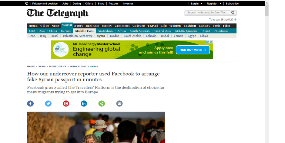 Σύμφωνα λοιπόν με την telegraph, υπάρχει στο διαδίκτυο και συγκεκριμένα στο Facebook, ένα γκρουπ το οποίο παρέχει οδηγίες για το πως θα περάσουν στην Ελλάδα και φυσικά για το πως θα προμηθευτούν πλαστά συριακά διαβατήρια. Δημοσιογράφος της telegraph προσποιήθηκε τον μετανάστη και με έναν αριθμό που υπάρχει στο σχετικό γκρουπ στο FB κανόνισε να περάσει από την Τουρκία στην Ελλάδα, με πλαστό συριακό διαβατήριο αξίας… 2.000£!