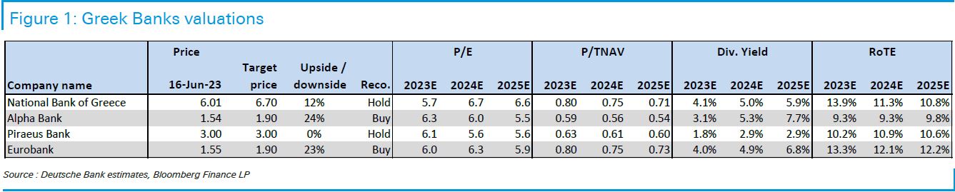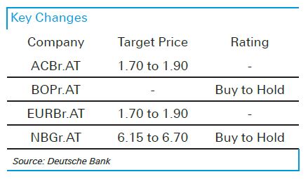 Ως αποτέλεσμα, η Deutsche Bank υποβαθμίζει τόσο την Εθνική Τράπεζα όσο και την Πειραιώς σε hold (διακράτηση), αλλά αυξάνει την τιμή στόχο στην Εθνική στα 6,70 ευρώ από 6,15 ευρώ προηγουμένως.