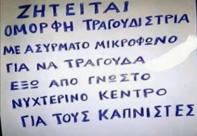«Ζητείται όμορφη τραγουδίστρια με ασύρματο μικρόφωνο για να τραγουδά έξω από γνωστό νυχτερινό κέντρο για τους καπνιστές», ανέφερε χαρακτηριστικά.