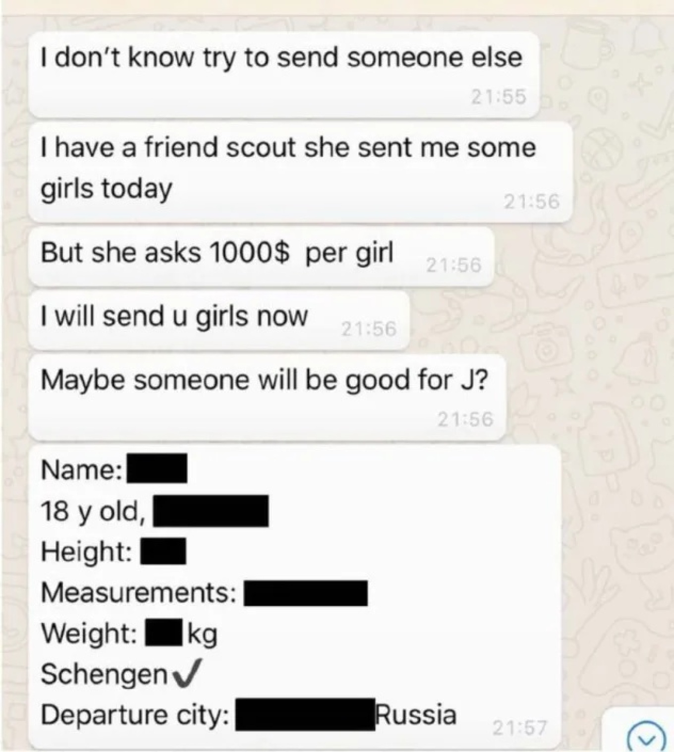 Το πιο ανατριχιαστικό στοιχείο, ωστόσο, είναι στιγμιότυπο συνομιλίας με αναφορές σε «αποστολή κοριτσιών», τιμές ανά άτομο και ψυχρή καταγραφή ηλικίας, σωματικών χαρακτηριστικών και χώρας μετακίνησης. Ένα λεξιλόγιο που θυμίζει κατάλογο, όχι ανθρώπινες ζωές. Τα ονόματα και οι λεπτομέρειες έχουν εν μέρει διαγραφεί, όμως το νόημα παραμένει ωμό και αμείλικτο.