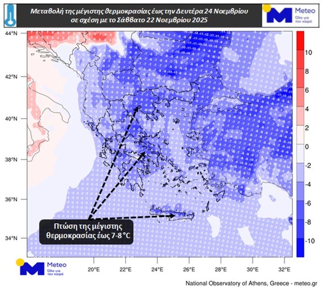 Όπως φαίνεται σε αυτόν, η συνολική πτώση στα ηπειρωτικά και στην Κρήτη θα φτάσει τοπικά τους 7-8 °C με αποτέλεσμα η θερμοκρασία τη Δευτέρα 24/11 να αναμένεται να μην ξεπεράσει τους 15-17 °C στα ηπειρωτικά και τις κεντρικές και βόρειες νησιωτικές περιοχές και τους 17-19 °C στις Κυκλάδες, στα Δωδεκάνησα και στην Κρήτη.
