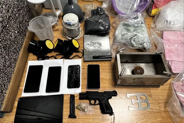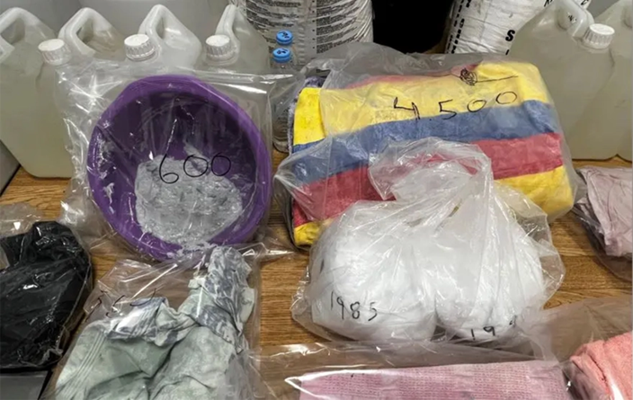 Στο διαμέρισμα-εργαστήριο στο Μενίδι βρέθηκαν και κατασχέθηκαν, μεταξύ άλλων 17,8 κιλά κοκαΐνης εμποτισμένη σε ενδύματα, 255,6 κιλά υγρής ουσίας και 45,5 κιλά λευκής σκόνης, κατάλληλη για νόθευση κοκαΐνης.