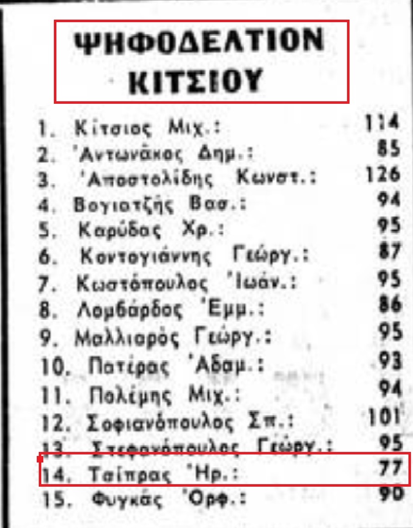 Πάνω: Παρατηρούμε στο αρχικό ψηφοδέλτιο του Κίτσιου στην προτελευταία θέση, υπάρχει το όνομα του κυρίου Ηρακλή Τσίπρα, θείου του Αλέξη Τσίπρα, όπου βρίσκεται στις συγκεκριμένες αρχαιρεσίες στο ψηφοδέλτιο του εκλεκτού της χούντας, λοχαγού των Καταδρομών, Μιχαήλ Κίτσιος.