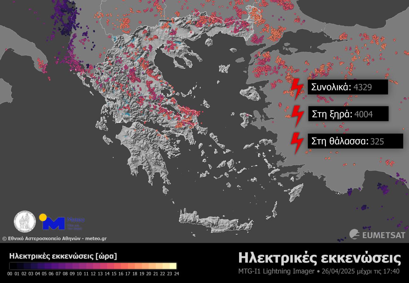 Ειδικότερα, μετά την ανάλυση δεδομένων από τον Ευρωπαϊκό μετεωρολογικό δορυφόρο τρίτης γενιάς Meteosat-12 και το Lightning Imager (LI) όργανο που φέρει, έδειξε ότι μέχρι τις 17:40 του Σαββάτου 26/04 έχουν καταγραφεί περισσότερες από 4.000 ηλεκτρικές εκκενώσεις, με τις περισσότερες να καταγράφονται στα ανατολικά και βόρεια ηπειρωτικά τμήματα, όπως διακρίνεται και στον παρακάτω χάρτη.