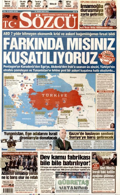 Η τουρκική εφημερίδα Σοζτζού κυκλοφόρησε σήμερα με πρωτοσέλιδο τίτλο «Είστε ενήμεροι; Μας περικυκλώνουν!» («Farkında mısınız, kuşatılıyoruz»), υποστηρίζοντας ότι οι Ηνωμένες Πολιτείες έχουν στήσει έναν εκτεταμένο στρατιωτικό δακτύλιο γύρω από την Τουρκία, από τη Μαύρη Θάλασσα μέχρι το Ιράκ, με τη συνεργασία της Ελλάδας.
