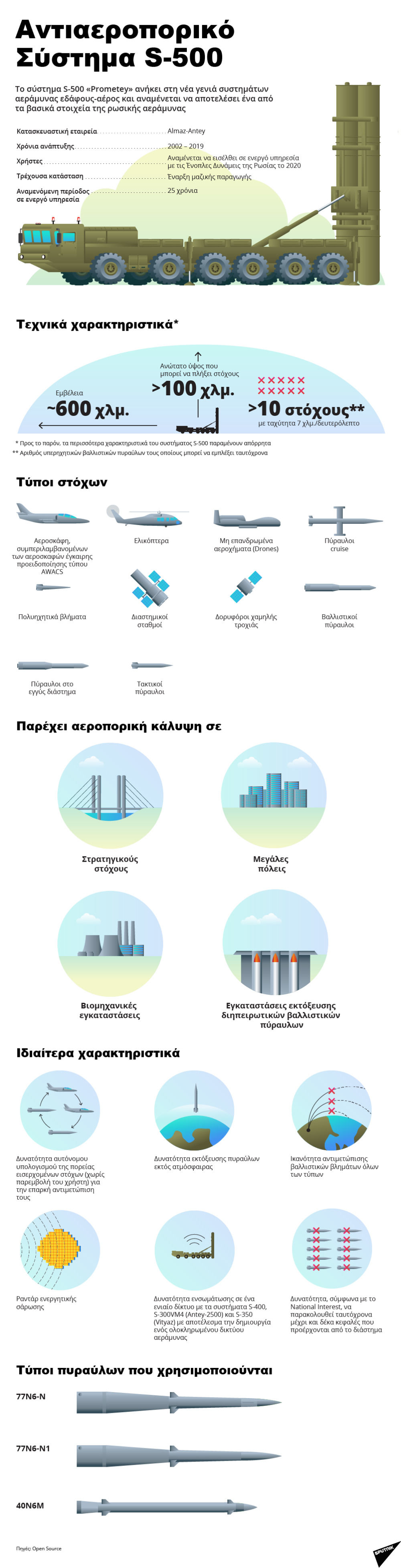 Συγκεκριμένα, το αντιαεροπορικό σύστημα S-500 «Prometey» κατασκευάζεται από την Almaz-Antey κι αναμένεται να εισέλθει σε ενεργό υπηρεσία στις Ρωσικές Ένοπλες Δυνάμεις το 2020, όμως έχει γίνει γνωστό ότι η εμβέλειά του θα είναι περίπου 600 χλμ, με το ανώτατο ύψος που μπορεί να πλήξει στόχους να ξεπερνά τα 100 χλμ. Ενώ ο μέγιστος αριθμός ταυτόχρονων στόχων που μπορεί να βάλλει φτάνει τους 10. Μεταξύ των στόχων μπορεί να είναι αεροσκάφη, ελικόπτερα, μη επανδρωμένα αεροσκάφη, πύραυλοι τύπου cruise, πολυηχητικά βλήματα, δορυφόροι χαμηλής τροχιάς, διαστημικοί σταθμοί, βαλλιστικοί πύραυλοι, πύραυλοι στο διάστημα και τακτικοί πύραυλοι.
