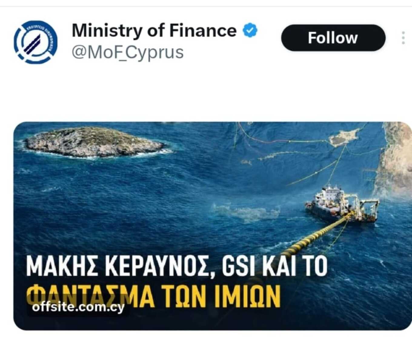 «Σφαλιάρα» στο ίδιο το κύρος της κυπριακής κυβέρνησης χαρακτηρίζουν πολιτικοί και διπλωματικοί κύκλοι στη Λευκωσία την υπόθεση με τον επίσημο λογαριασμό του Υπουργείου Οικονομικών στο X, ο οποίος αναδημοσίευσε άρθρο γνώμης για το έργο GSI και στη συνέχεια το εξαφάνισε αθόρυβα, χωρίς καμία δημόσια εξήγηση.