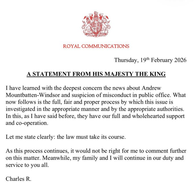 Αναλυτικά, όπως τονίζει ο ίδιος στη δήλωσή του, «έμαθα με βαθιά ανησυχία τα νέα σχετικά με τον Άντριου Μαουντμπάτεν-Γουίντσορ και την υποψία για παράβαση καθήκοντος».