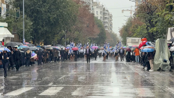 Υπό βροχή πραγματοποιείται η μαθητική παρέλαση για την 28η Οκτωβρίου στη Θεσσαλονίκη.