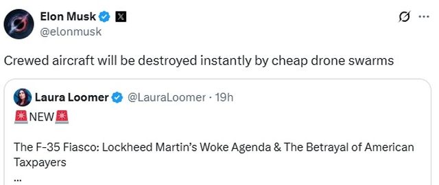 Σε μια αναδημοσίευση στο «Χ» που κοινοποιήθηκε την Τρίτη 29/04, ο Μασκ ενίσχυσε μια δήλωση της πολιτικής σχολιάστριας Λόρα Λούμερ, η οποία χαρακτήρισε το πρόγραμμα F-35 «μια πολυδισεκατομμυριούχο προδοσία του Αμερικανού φορολογούμενου και της εθνικής μας ασφάλειας».
