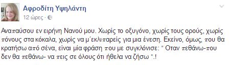«Αναπαύσου εν ειρήνη Νανού μου. Χωρίς το οξυγόνο, χωρίς τους ορούς, χωρίς πόνους στα κόκαλα, χωρίς να μ΄εκλιπαρείς για μια ένεση. Εκείνο, όμως, που θα κρατήσω από σένα, είναι μία φράση που με συγκλόνισε: » Οταν πεθάνω-που δεν θα πεθάνω- να πεις σε όλους ότι ήθελα να ζήσω».