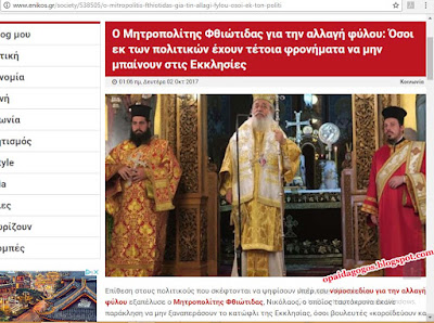 ΔΕΙΤΕ τι δήλωνε ο μητροπολίτης Φθιώτιδος Νικόλαος (01 Οκτωβρίου 2017) για όσους βουλευτές ΨΗΦΙΣΟΥΝ το νομοσχέδιο αλλαγής φύλου :