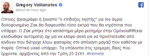 «Οποιος ξαναγράψει ή ξαναπεί «ο επίδοξος ληστής» για τον άγρια δολοφονημένο Ζακ θα διαψευσθεί τόσο εικτρά(sic) που θα ντρέπεται που υπάρχει. O Zακ μπήκε στο κατάστημα μέρα μεσημέρι στην Ομόνοια!!!!!(και κλειδώθηκε αυτόματα) όχι για να κλέψει αλλά για να προστατευθεί από κίνδυνο που διέτρεχε λόγω φασαρίας στο απέναντι μαγαζί που καθόταν με παρέα. Οπτικό υλικό υπάρχει. Τα υπόλοιπα στις τρομερές δίκες που έρχονται, αρχίζοντας από την Τρίτη 25 Σεπτ. #tremete», αναφέρει χαρακτηριστικά στην ανάρτηση σου στο Facebook.