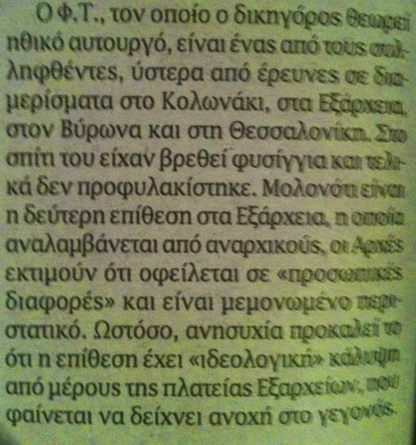 Χαρακτηριστικό παράδειγμα είχαμε την περασμένη Πέμπτη, στις 6.45 τα ξημερώματα,που άγνωστοι δράστες με καλυμμένα τα χαρακτηριστικά τους, έσπασαν την τζαμαρία του κτιρίου όπου στεγάζεται η εφημερίδα Athens Voice και περιέλουσαν τους εσωτερικούς χώρους με εύφλεκτο υλικό -πιθανότατα βενζίνη- και πυρπόλησαν τα γραφεία του αθηναϊκού free press.